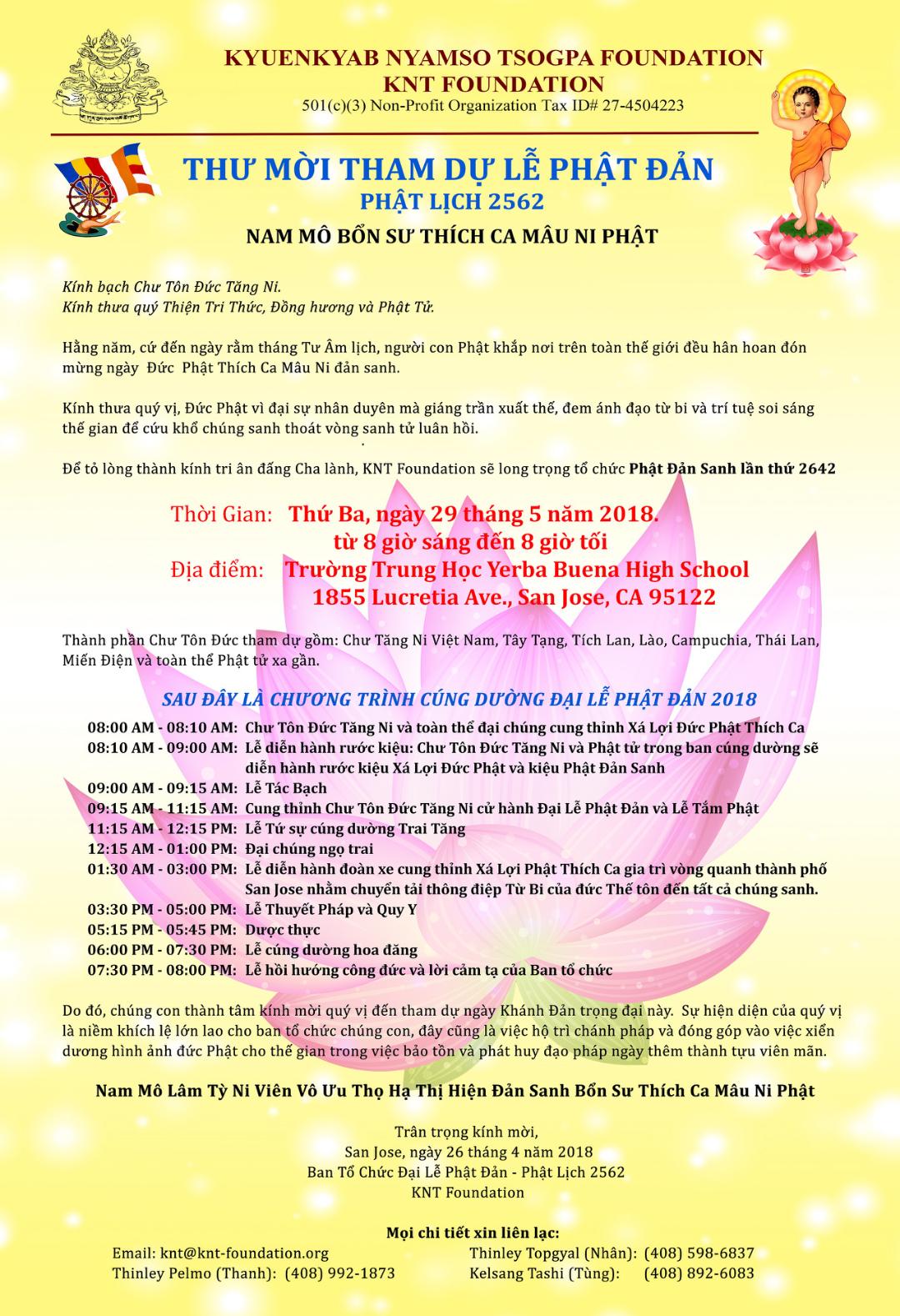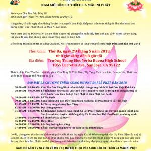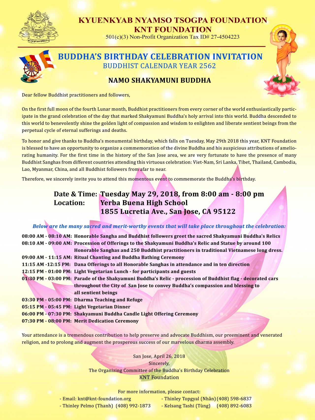 To honor and give thanks to Buddhas monumental birthday, which falls on Tuesday, May 29th, 2018 this year, KNT Foundation is blessed to have an opportunity to organize a commemoration of the divine Buddha and his auspicious attributions of ameliorating humanity. For the first time in the history of the San Jose area, we are very fortunate to have the presence of many Buddhist Sanghas from different countries attending this virtuous celebration: Viet-Nam, Sri Lanka, Tibet, Thailand, Cambodia, Lao, Myanmar, etc.., and all Buddhist followers from afar to near.